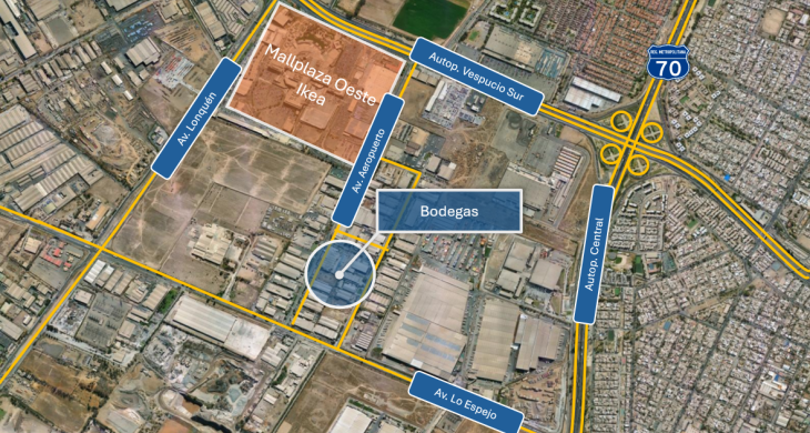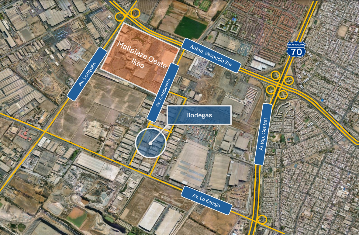 Conectividad por Autopistas Vespucio Sur y General Velasquez, además de Av. Lo Espejo y Av. Aeropuerto. (Ver imágen del mapa)