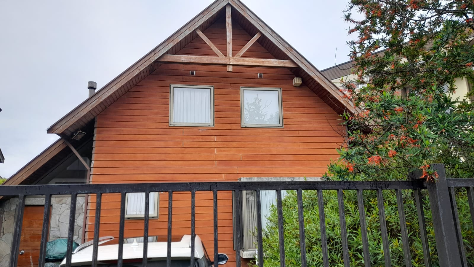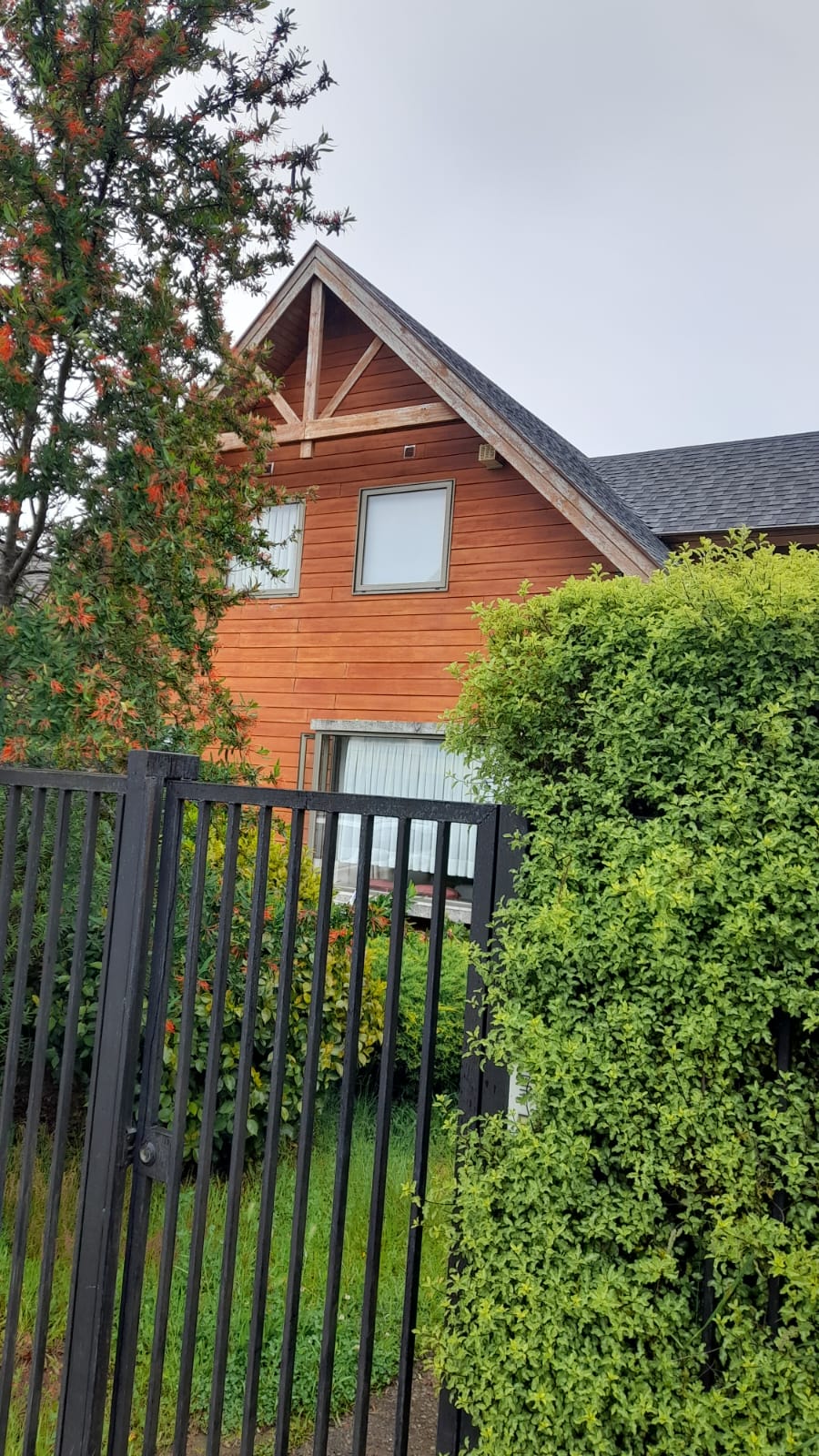 Patio trasero con vista al río cruces y Quincho techado con barbacoa.