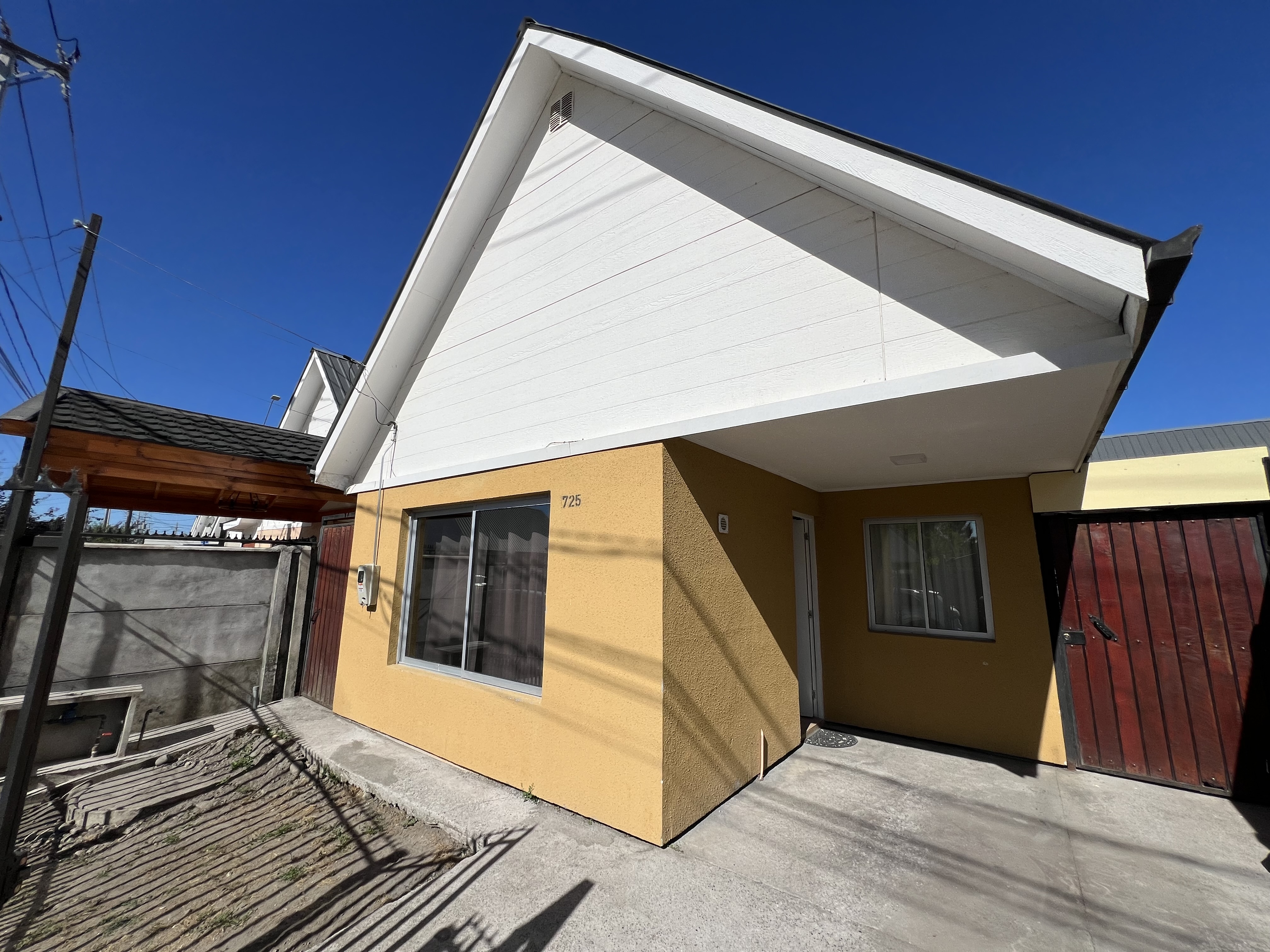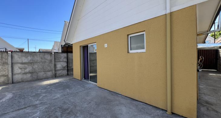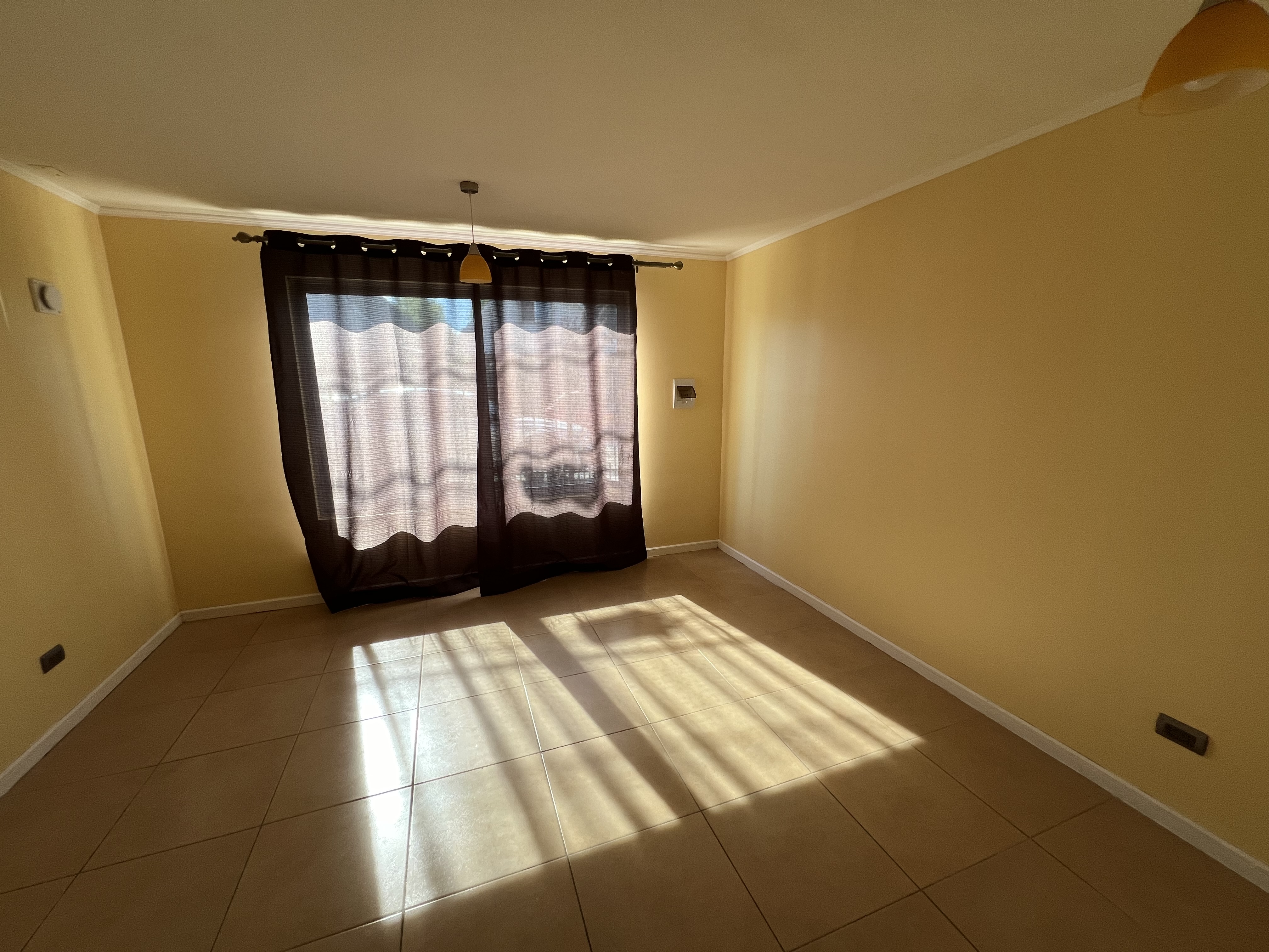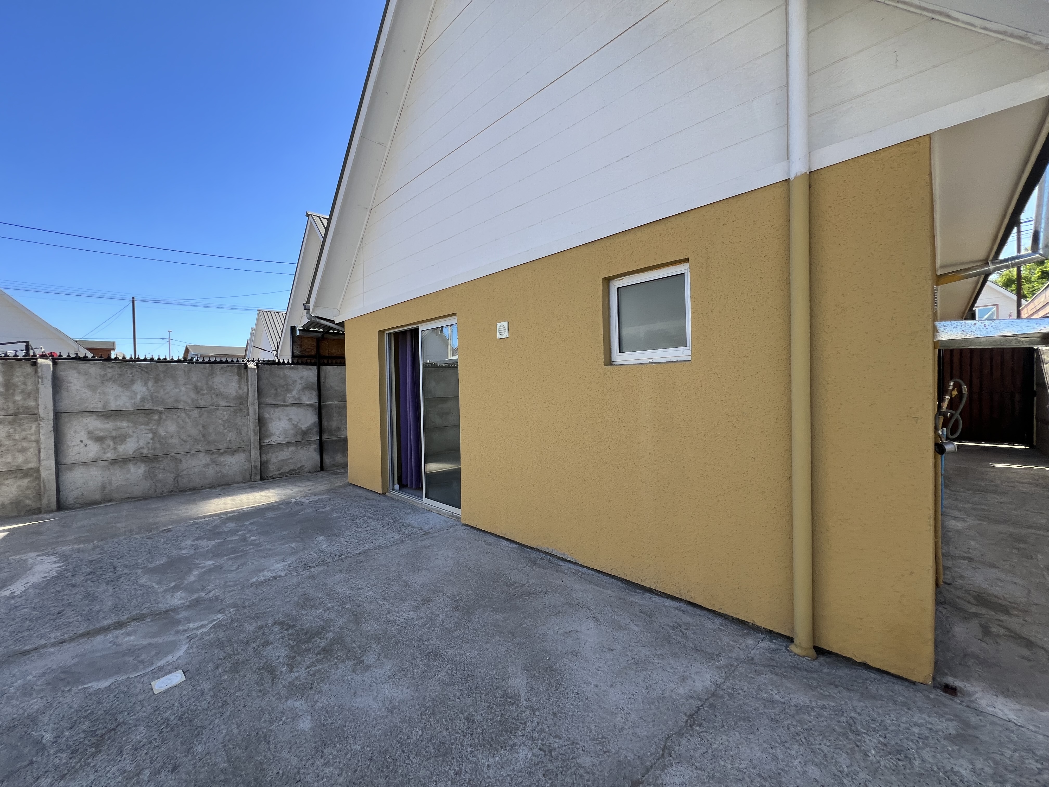 Cortinas, luminarias, patio con radier y portones metal-madera en patio interior.