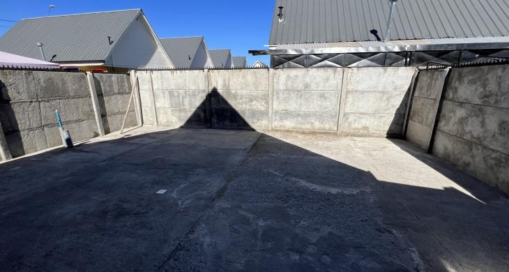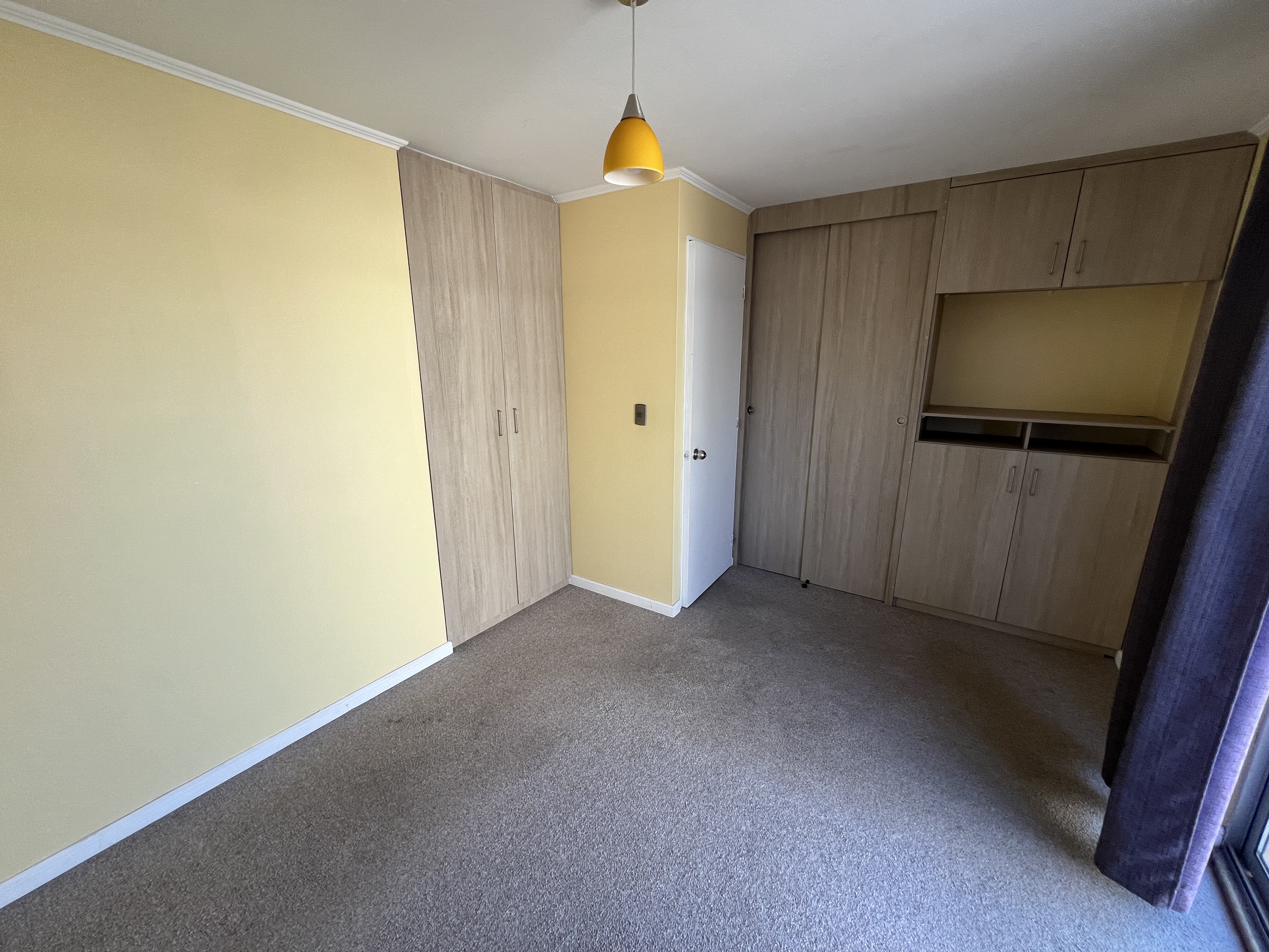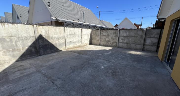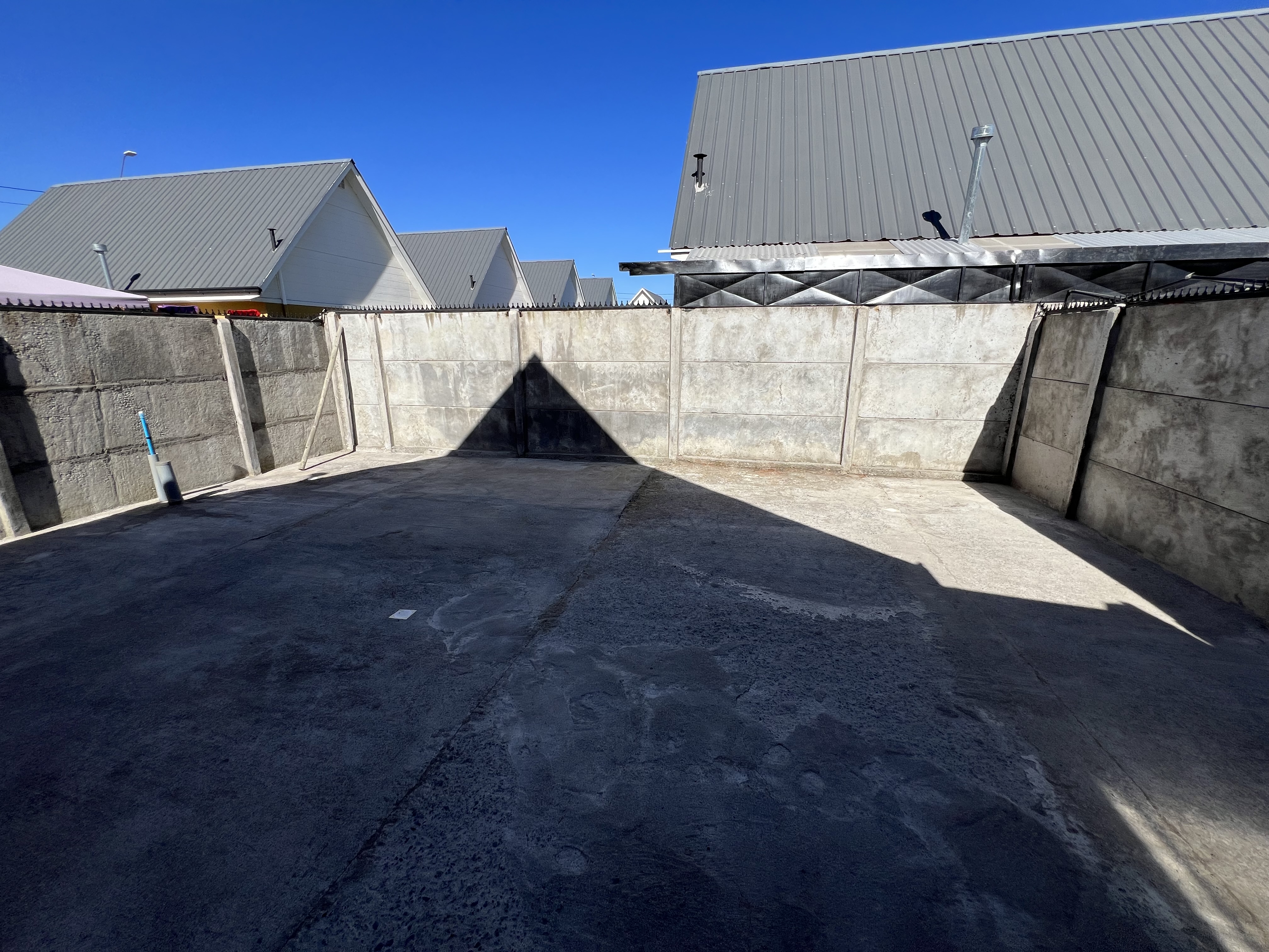 Cortinas, luminarias, patio con radier y portones metal-madera en patio interior.