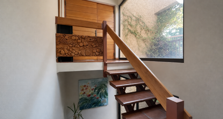 Construida sobre un terreno en desnivel, rodeado de vegetación nativa, senderos y áreas verdes, la vivienda se distribuye en dos niveles: