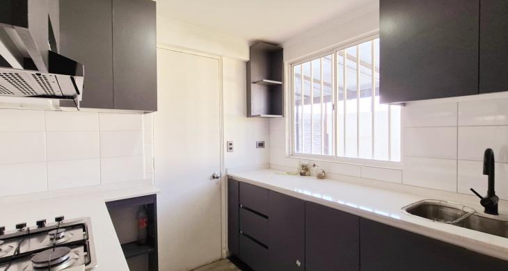 cocina Concepto cerrado con muebles Nuevos ,Empotrados .Equipada con horno,Campana y encimera .Puerta con salida A estacionamiento .