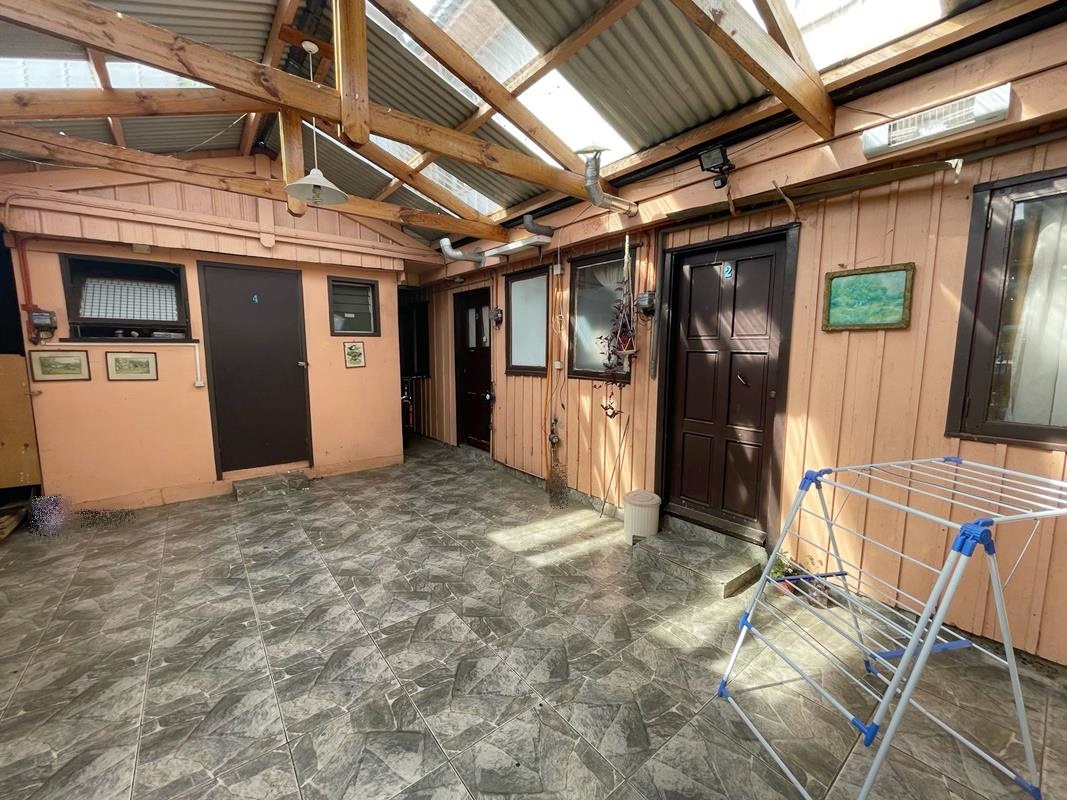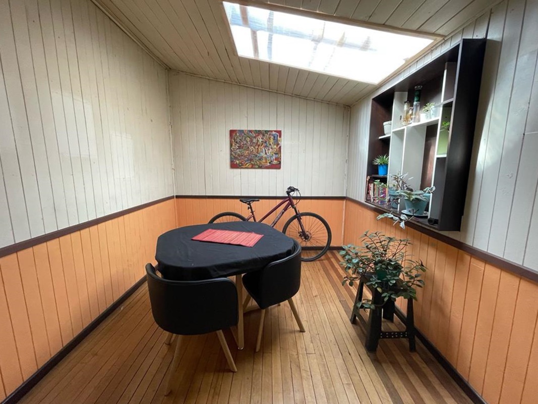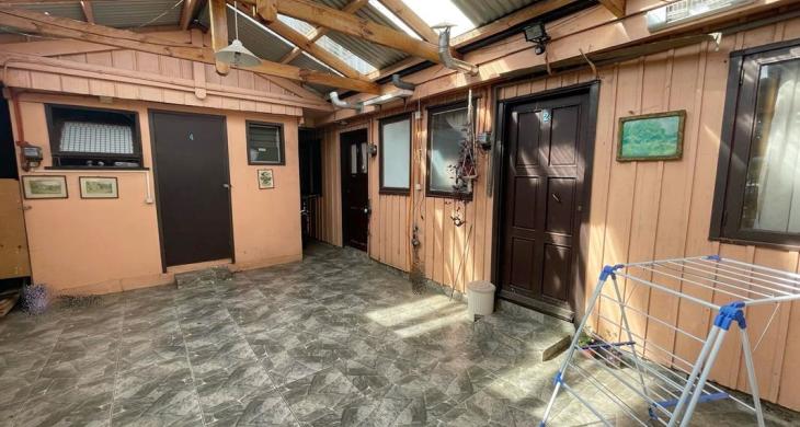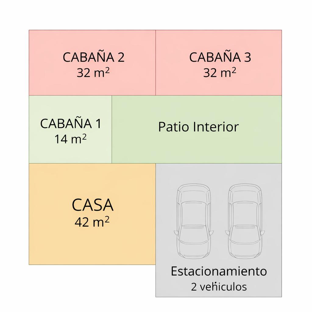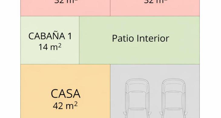 Casa principal con liviny y comedor amplio, cocina y dos dormitorios , dos baños. Con tres cabañas dúplex , independientes en sus segunods pisos con un dormitorio y un baño cada una, se comparte en el primer piso living-comedor y cocina.