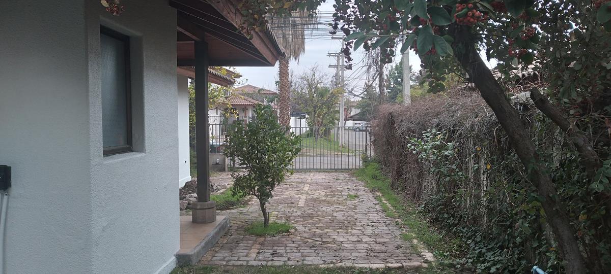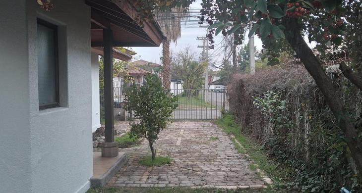 Patio amplio y agradable con terraza semi techada con piso de piedra pelequén, césped, arboles, plantas y arbustos como, níspero, naranjo, peumo, limón, matico entre otros.