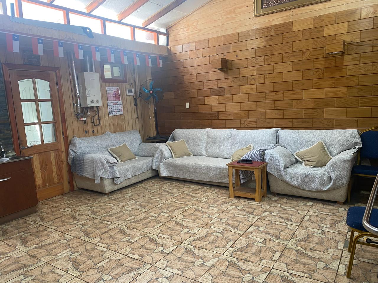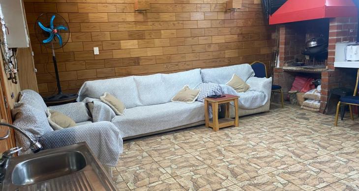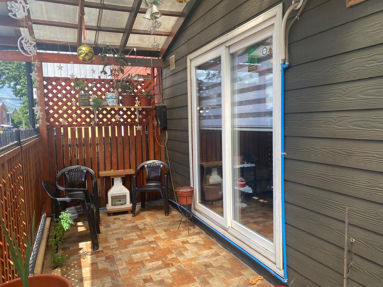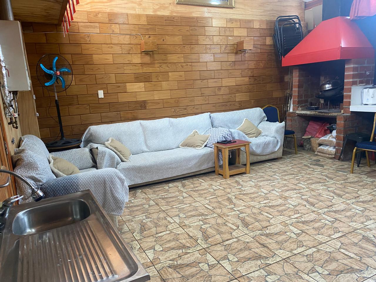 Hermoso quincho techado revestido en madera, estacionamiento techado en la entrada.