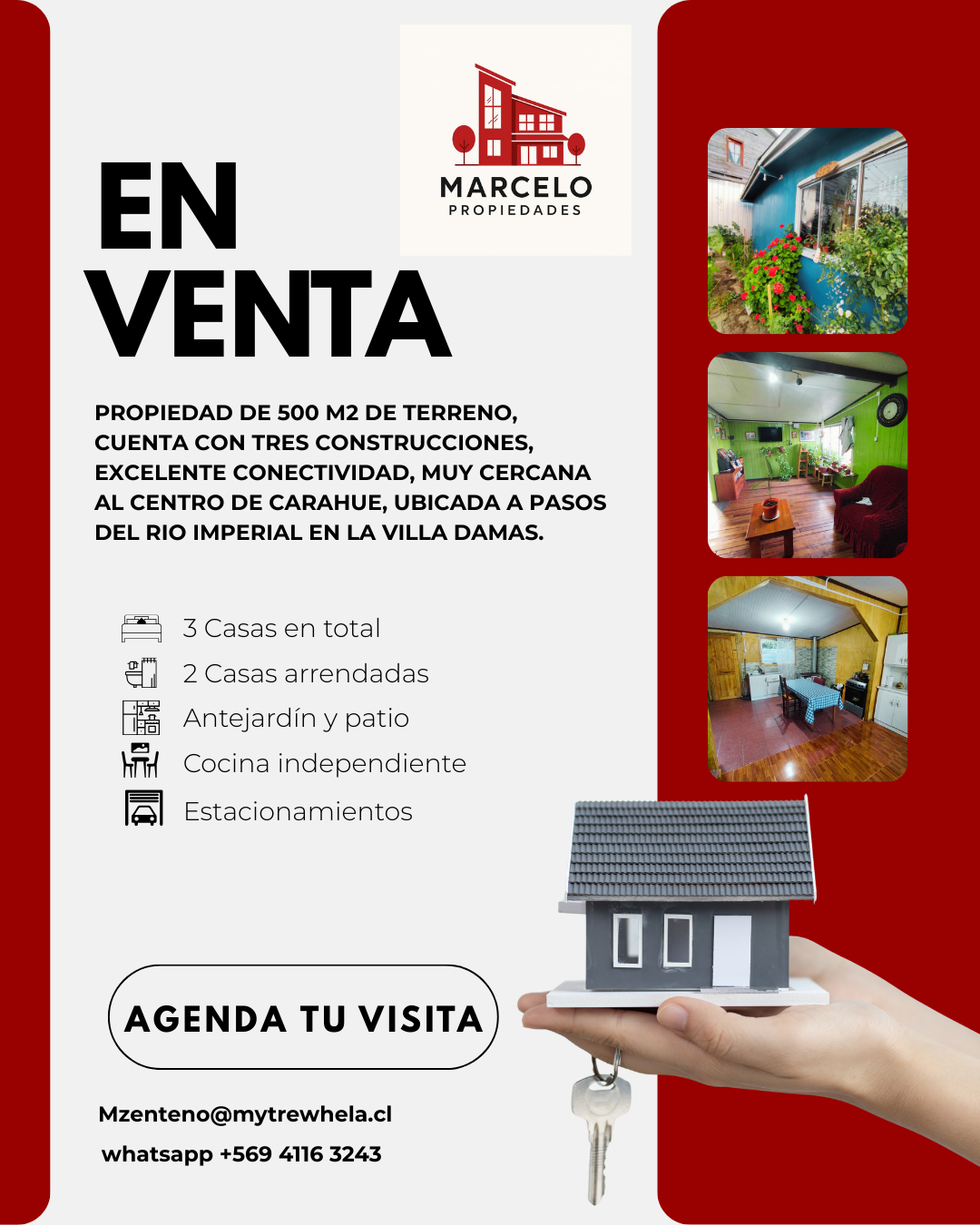 Descubre una oportunidad única de inversión y vivienda en la apacible comuna de Carahue. Este extenso sitio con tres casas ofrece un potencial inigualable para familias grandes, inversionistas o aquellos que buscan un espacio amplio para desarrollar sus proyectos. Ubicado en el tranquilo sector de Villa Damas, este terreno de casi 500 m² alberga tres viviendas que suman aproximadamente 150 m² construidos, ofreciendo un total de 6 dormitorios y 3 baños. Ideal para quienes buscan una propiedad con múltiples opciones de uso, desde el arriendo hasta la residencia familiar multigeneracional. La propiedad cuenta con generosos espacios exteriores y capacidad para estacionar hasta 5 vehículos, proporcionando comodidad y funcionalidad. Si bien las construcciones son usadas, ofrecen una base sólida para renovaciones o ampliaciones, permitiendo adaptar el espacio a tus necesidades y gustos. El terreno de 500 m² aprox. ofrece un amplio espacio para jardines, áreas de recreación o incluso la posibilidad de construir adicionales, su ubicación en un barrio tranquilo proporciona un ambiente seguro y familiar a pasos del rio Imperial. En cuanto al entorno, Villa Damas en Carahue ofrece una excelente conectividad con el centro de la ciudad y sus servicios, como colegios, supermercados y centros de salud. La cercanía a la naturaleza y la tranquilidad del entorno rural complementan la comodidad de tener acceso a las necesidades básicas. No pierdas esta oportunidad de adquirir un sitio con múltiples posibilidades en Carahue. Contáctanos hoy mismo para obtener más información y coordinar una visita. ¡Esta podría ser la inversión que estabas esperando!`