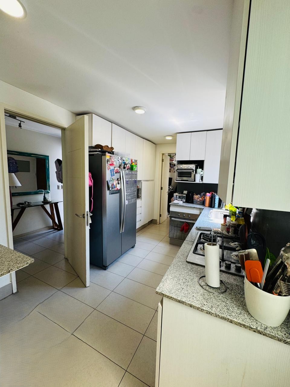 Acogedor Living Comedor, Cocina Equipada con horno empotrado, cocina encimera y campana.