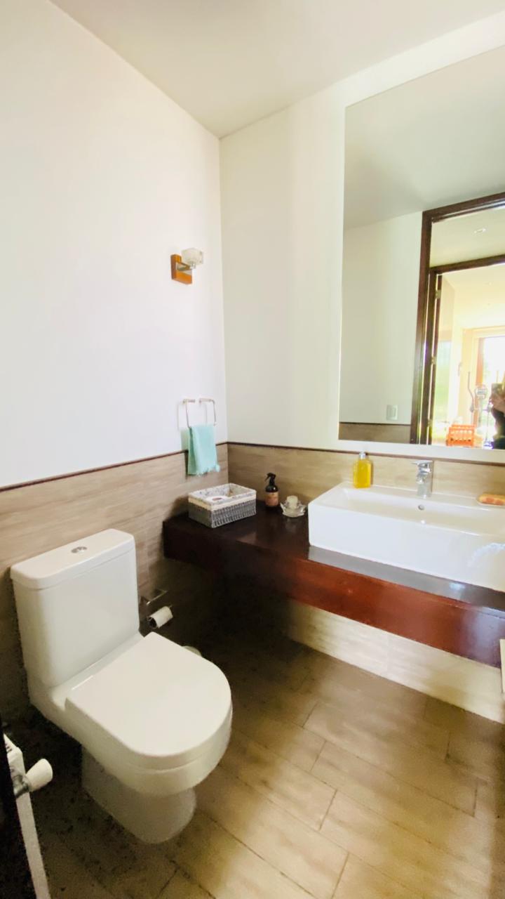 Hall de Entrada amplio, con acceso a Living Comedor de gran tamaño con vista al jardín. Baño de Visita, Amplia Cocina con una gran isla y equipada con horno empotrado, cocina encimera y campana. Logia techada con amplios espacios, Pieza y Baño de Servicio.