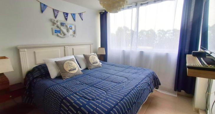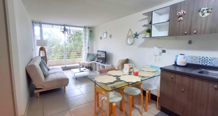 Se arrienda año corrido este hermoso departamento amoblado, en Condominio Costa Algarrobo Norte, recinto muy tranquilo y seguro. Orientación Poniente, piso 8, con linda vista a jardines interiores , piscina y a distancia el mar.