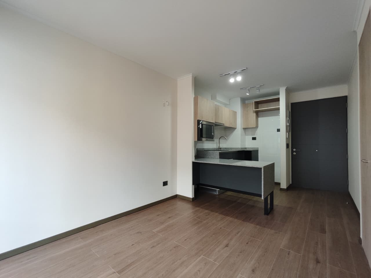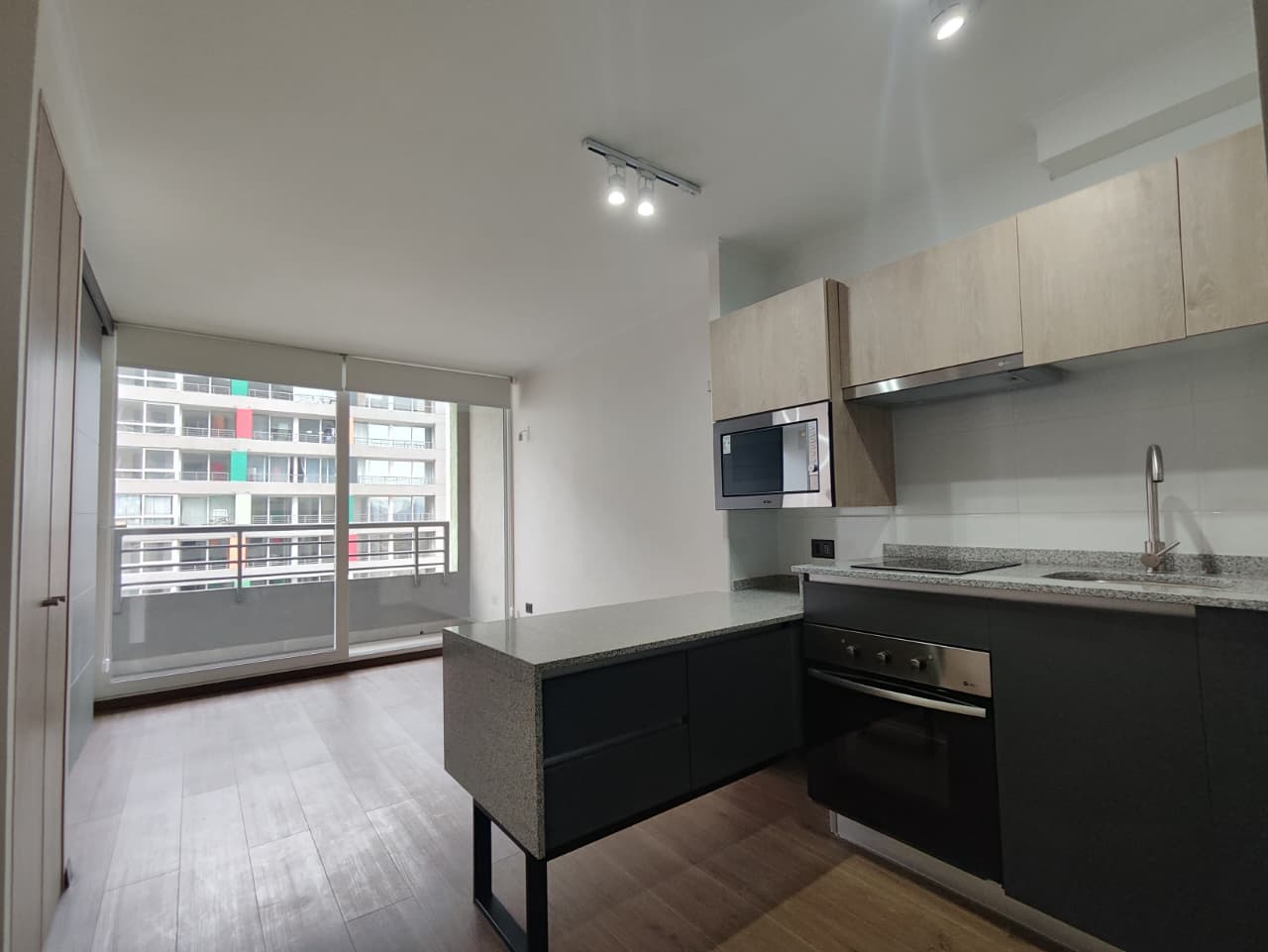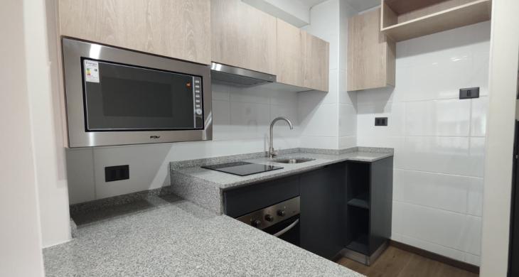 Departamento cuenta con cortinas, focos, soporte para Tv, balcón amplio, microondas y conexión a lavadora.