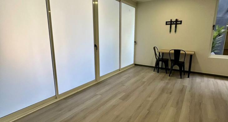 Oficina cuenta con cocina encimera, horno y campana, refrigerador, microondas, comedor, sillon, entre otras cosas...