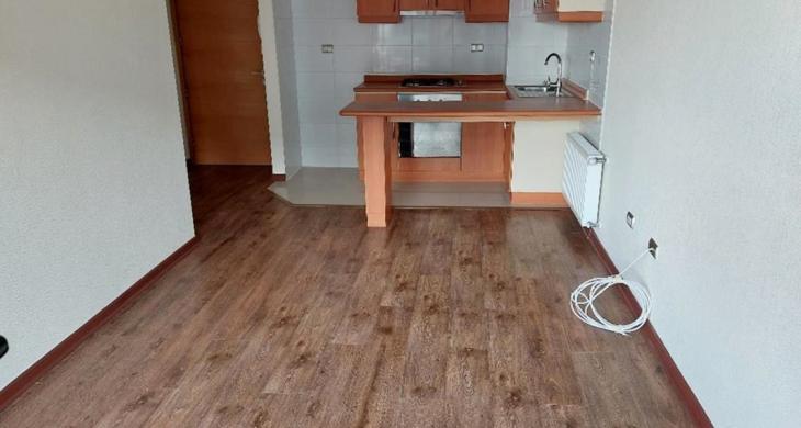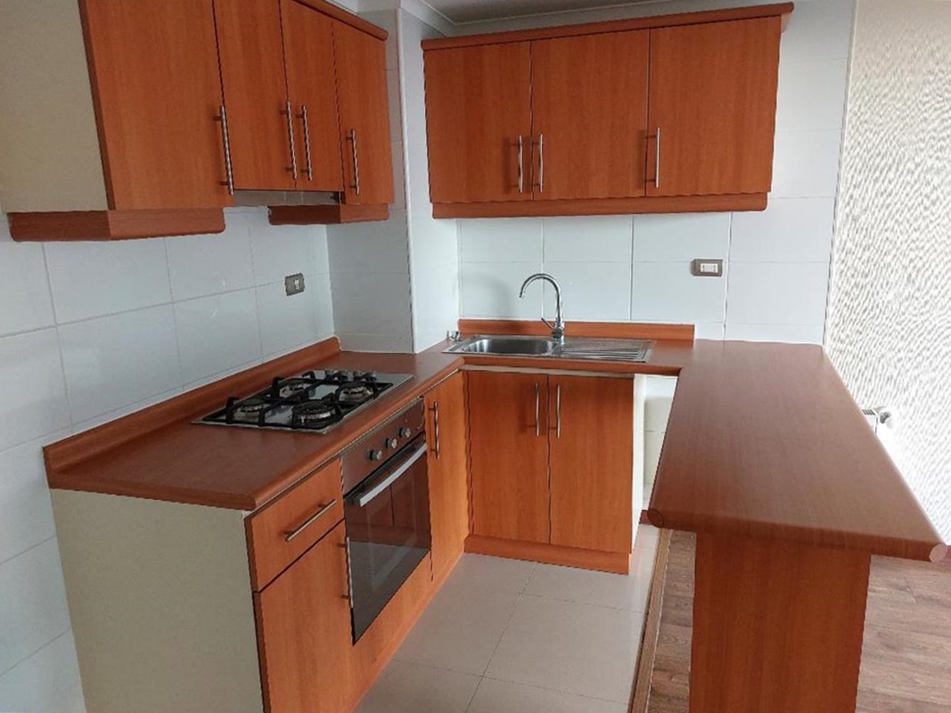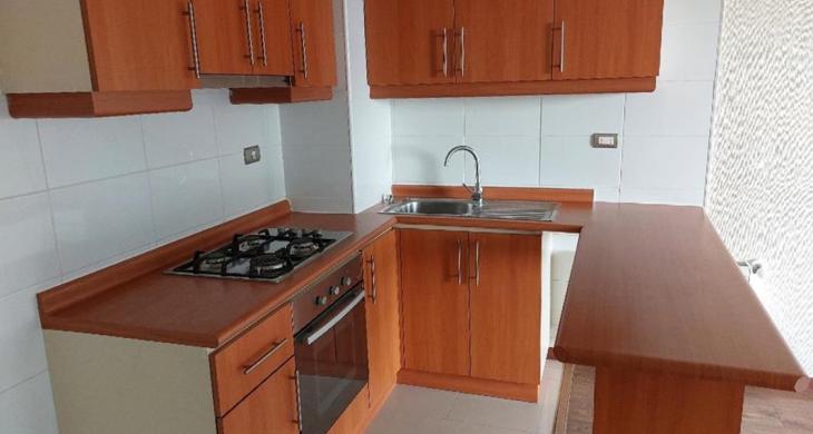 Moderno departamento en un piso sexto, con entrada a sala con salida a terraza, vista al rio, cocina concepto abierto, con mueble, mesón y equipada con encimera cuatro platos, horno electrico, campana.