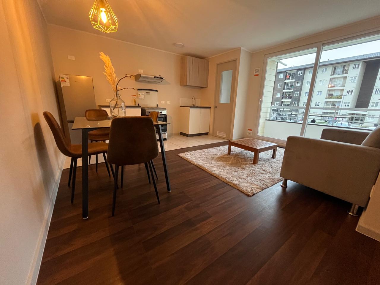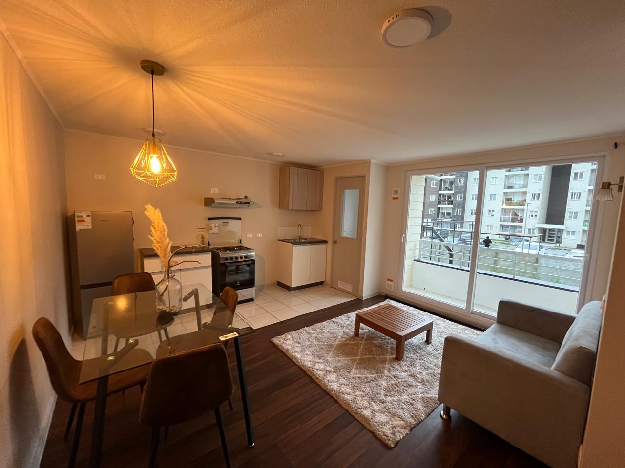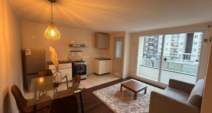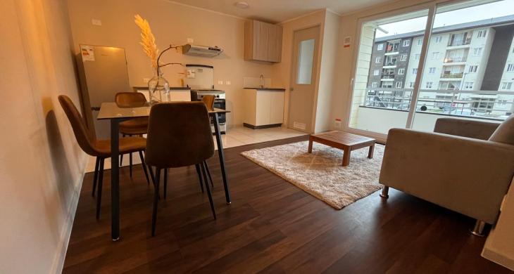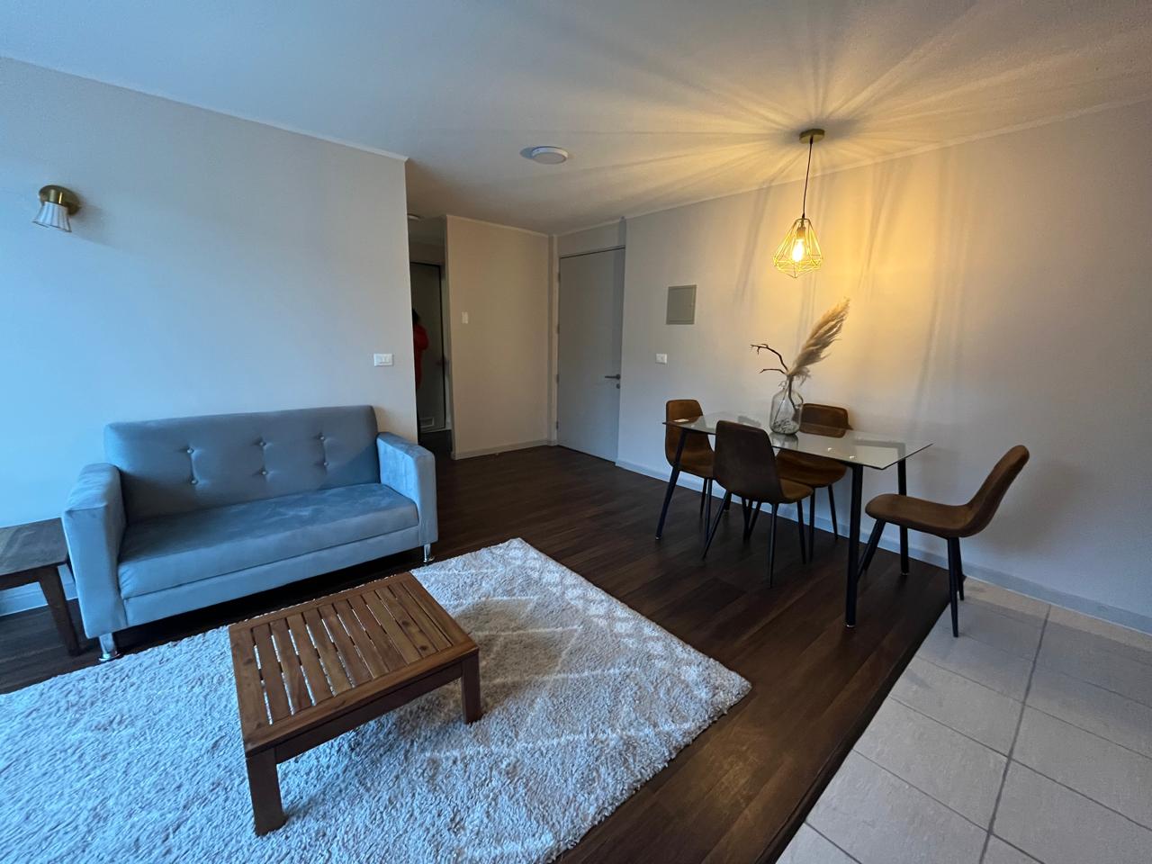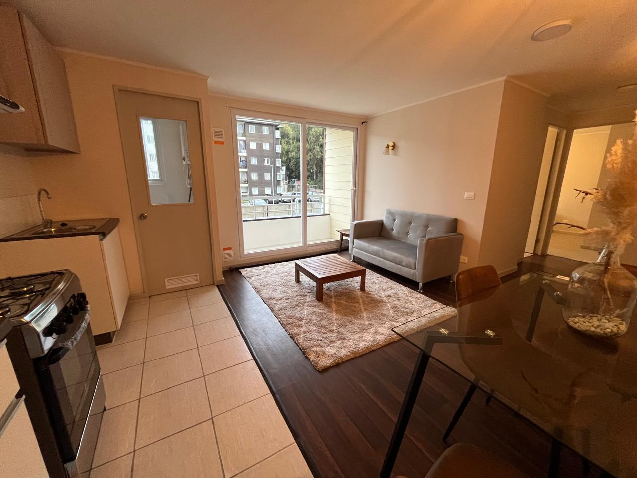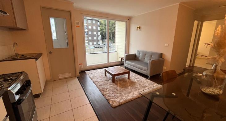 Departamento AMOBLADO en Condominio. Living comedor con terraza, cocina abierta, logia. Dos dormitorios y un baño. Cercano a avenida Pedro Aguirre Cerda e Inacap. SIN Estacionamiento. Arriendo Año Corrido.
