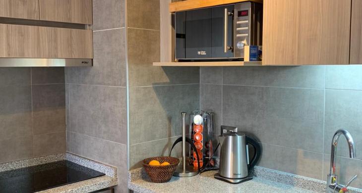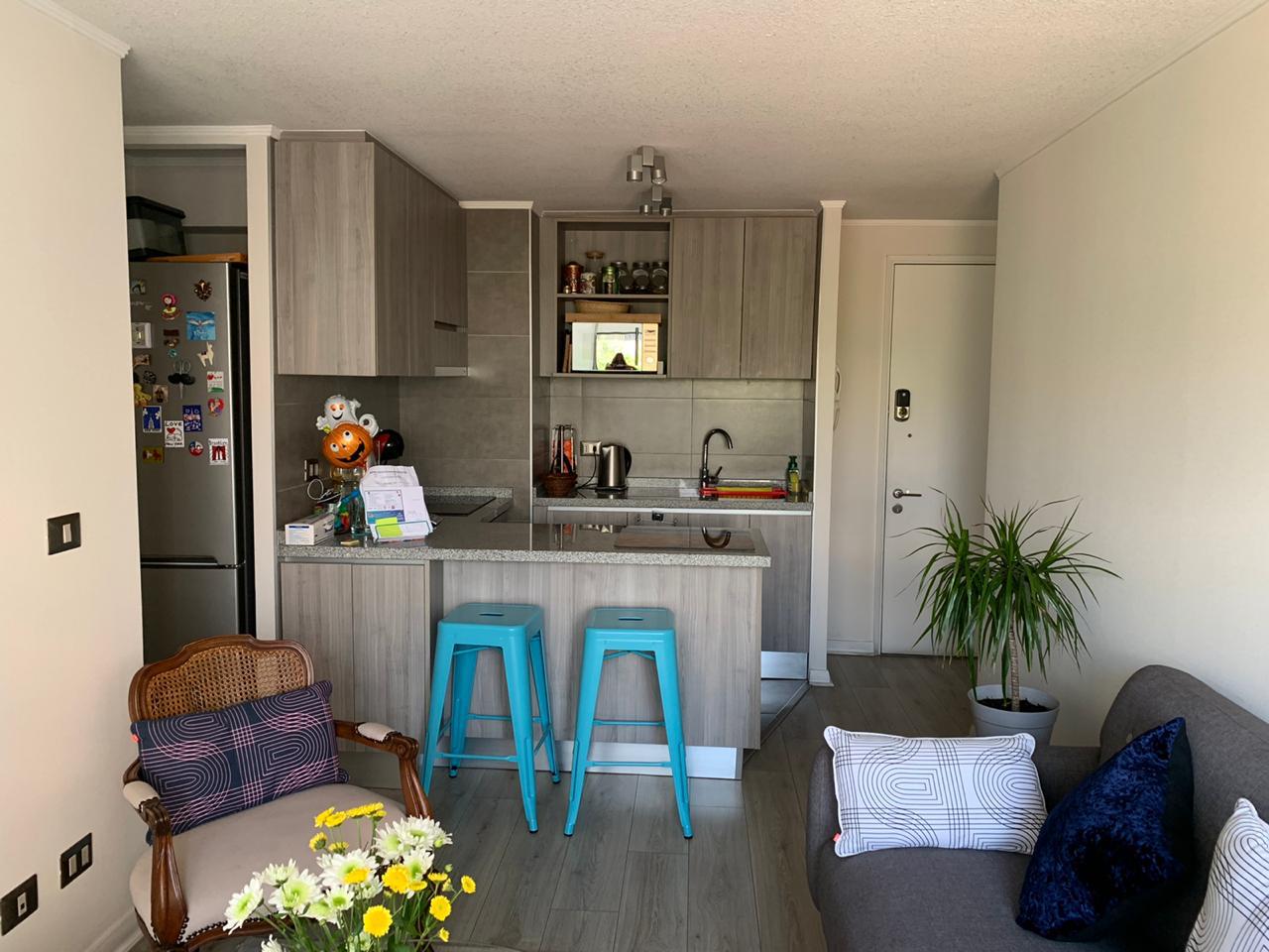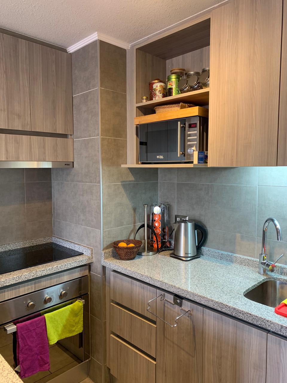 Cocina americana full equipada, cuenta con encimera vitroceramica, horno, campana, meson de comedor de diario, conexion a lavadora y muebles de cocina