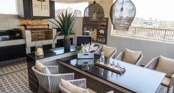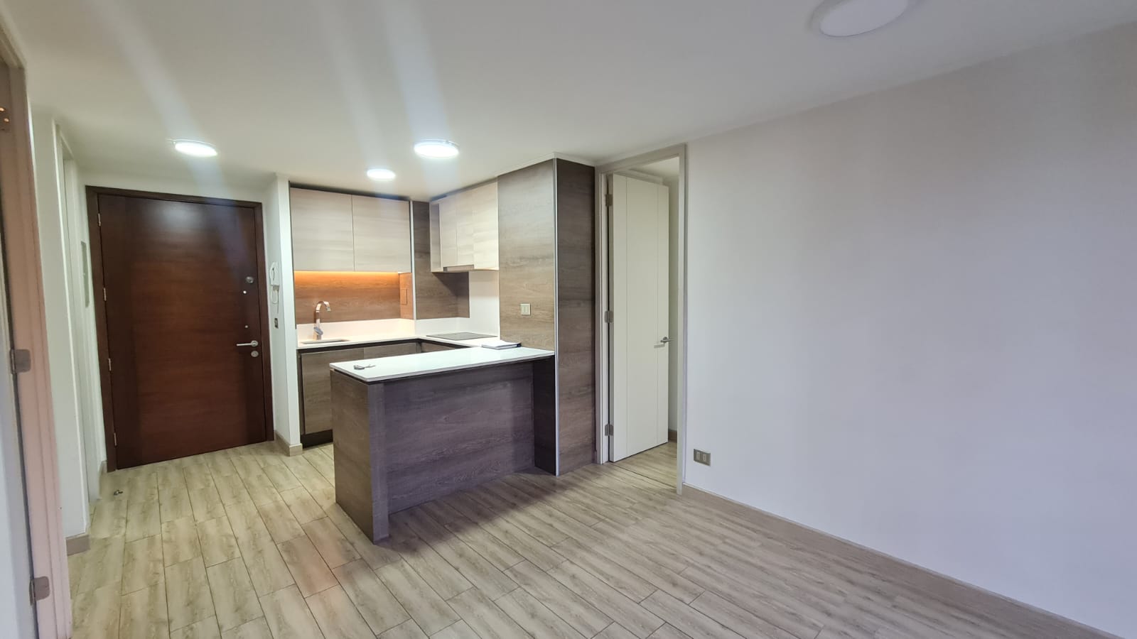 Cocina americana con cubierta de cuarzo, equipada con encimera vitrocerámica, horno eléctrico y campana eléctrica.