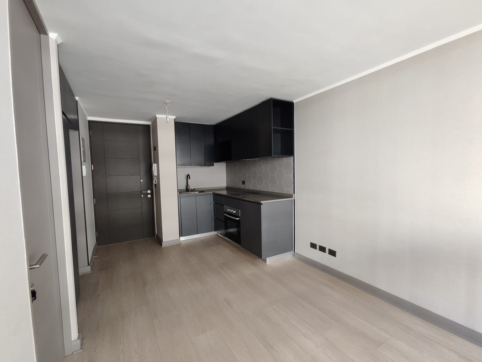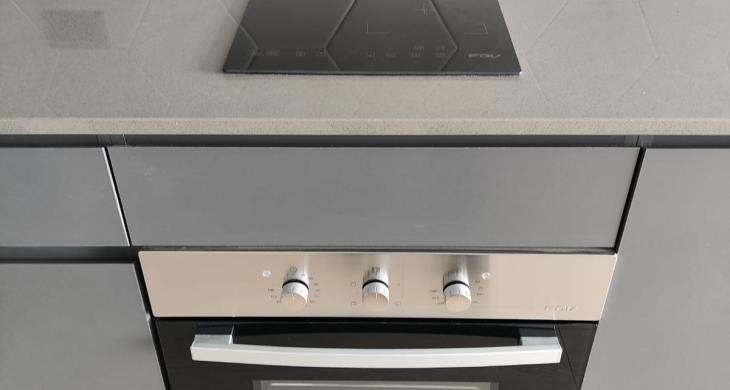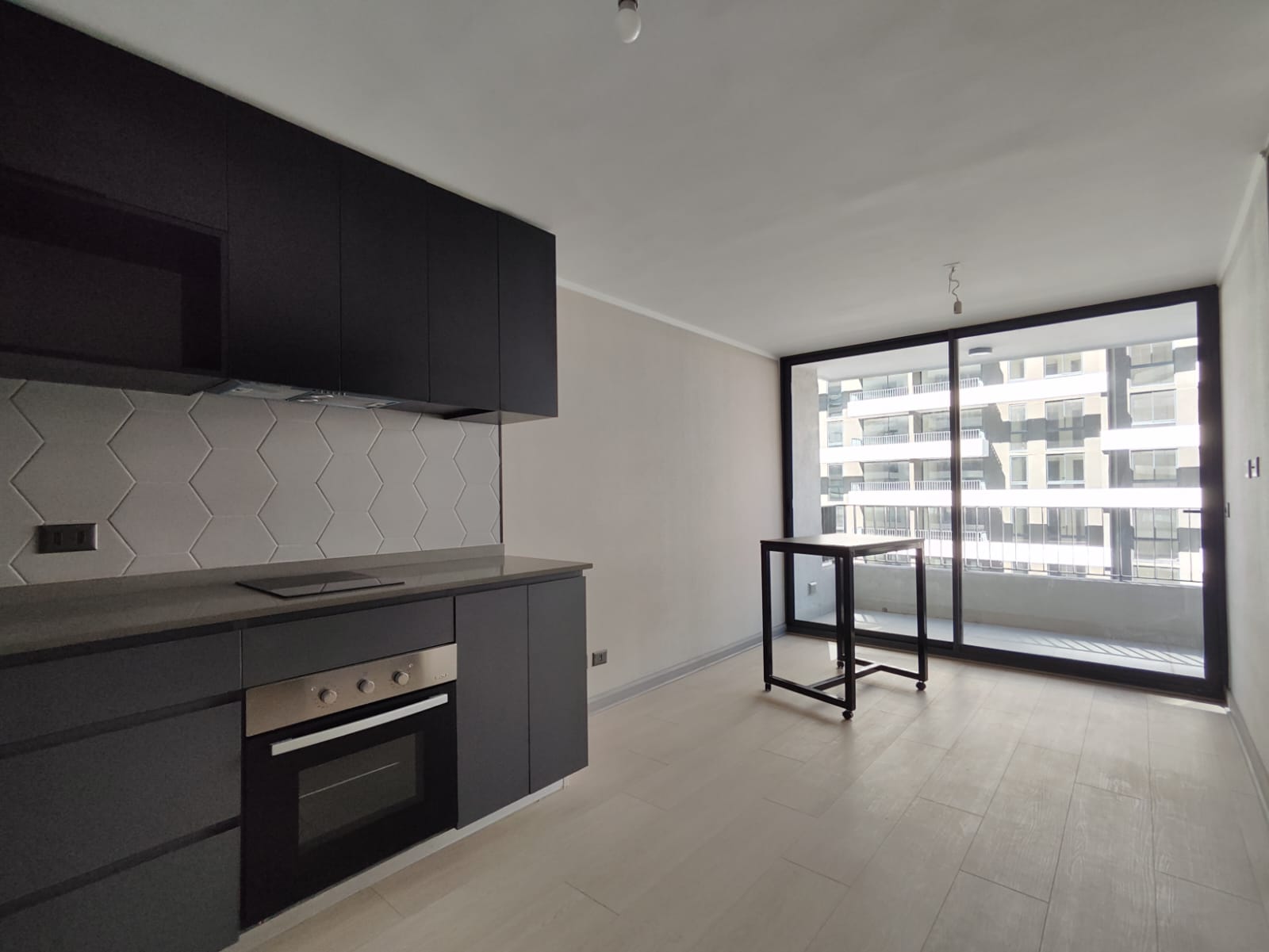 Depto. cuenta con cocina encimera, horno y campana, vista despejada.