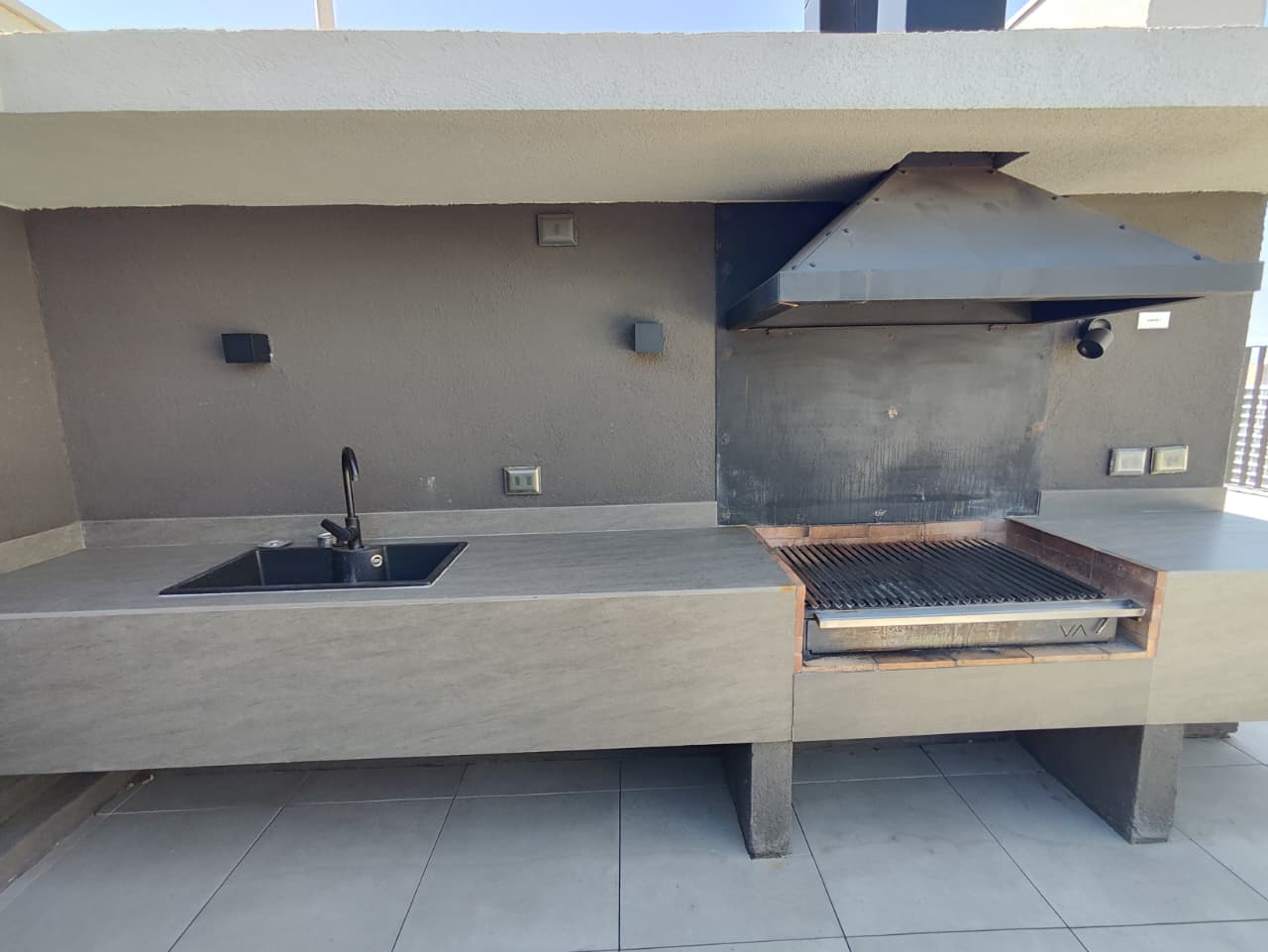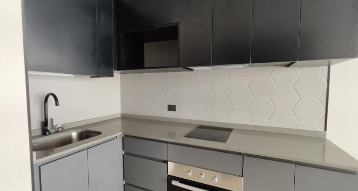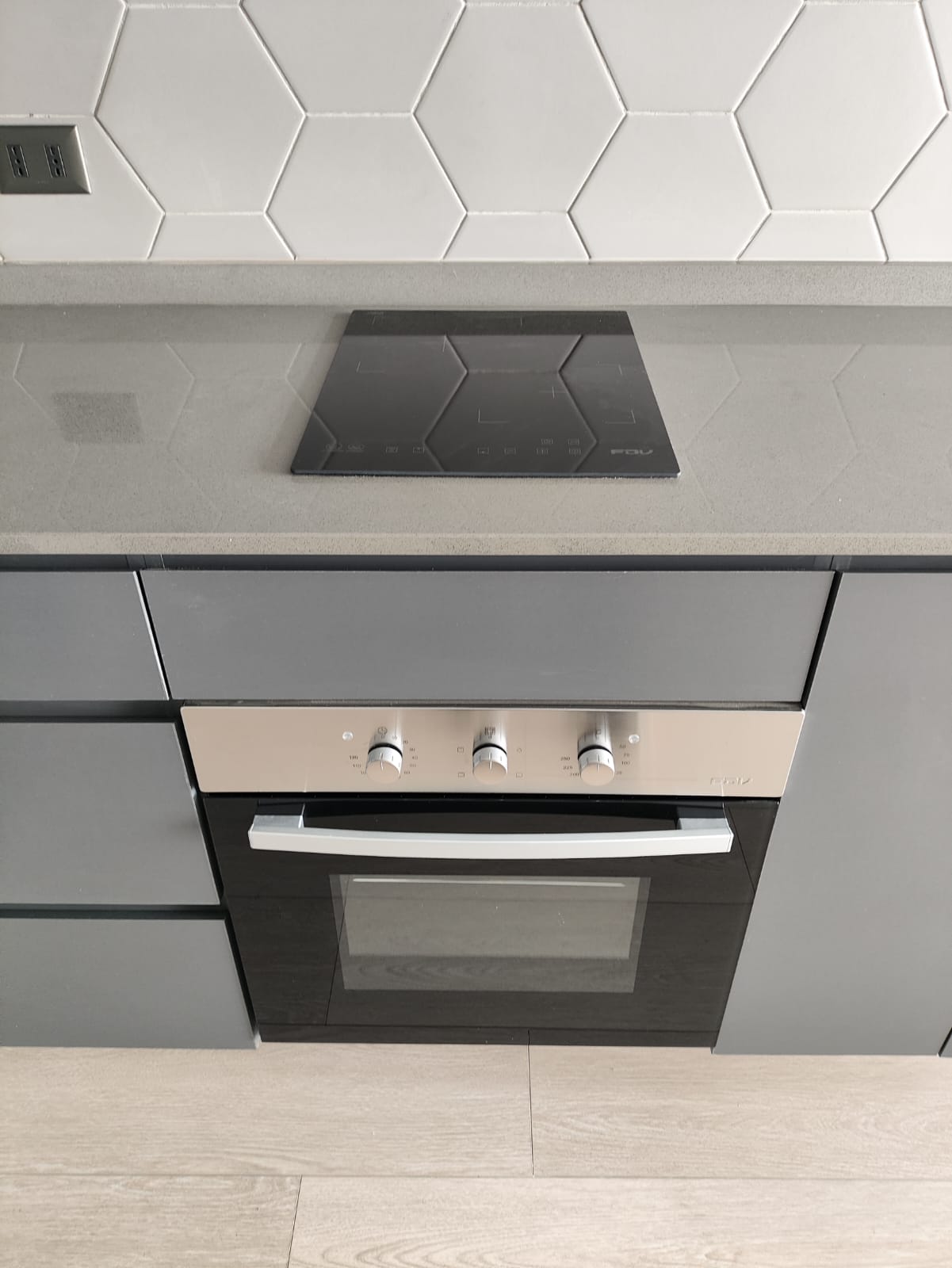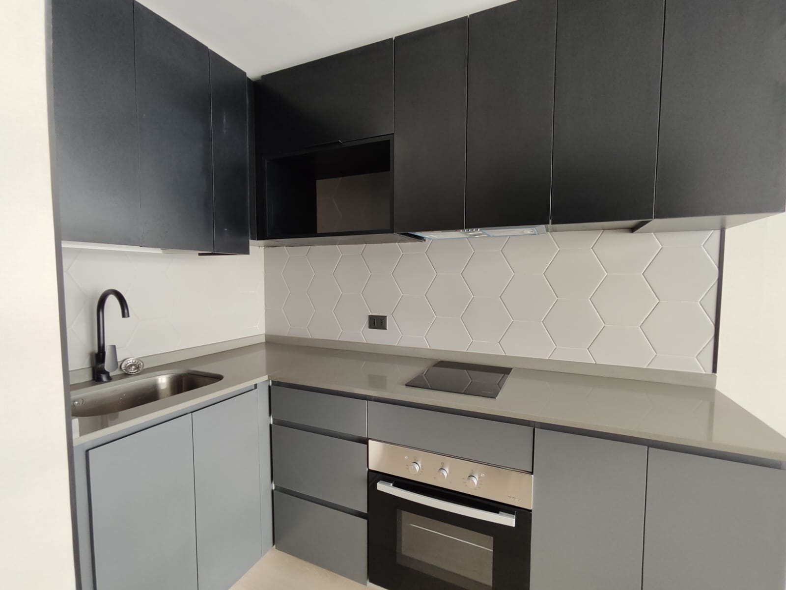 Depto. cuenta con cocina encimera, horno y campana, vista despejada.