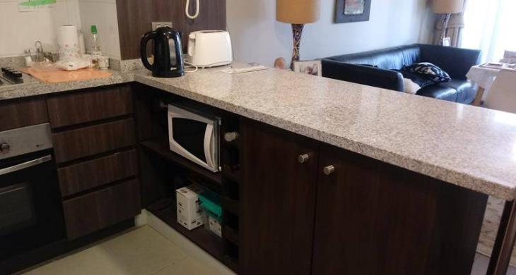 Concepto abierto, cocina estilo americana, con muebles y compartimentos, mesón granito, y equipada con encimera, horno, campana. Cuenta con conexión a lavadora.