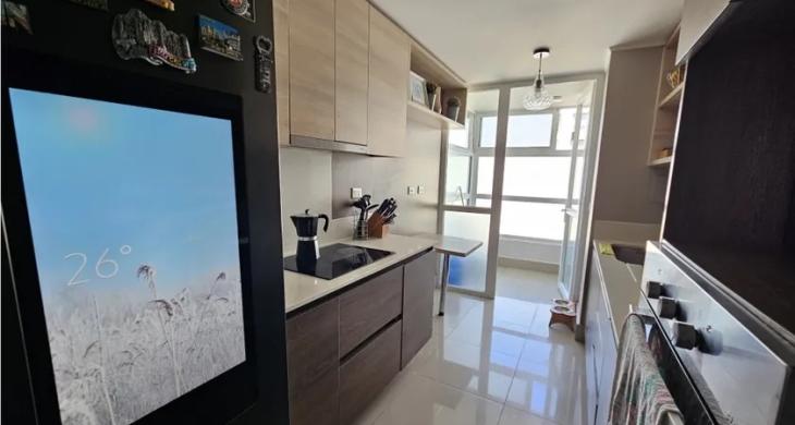 Departamento con amplios espacios, terraza con ampliacion , cerrado con cortina de cristal creando un ambiente adicional en una terraza con vista despejada.