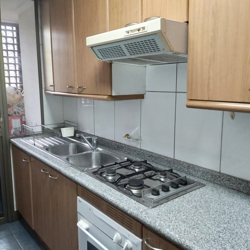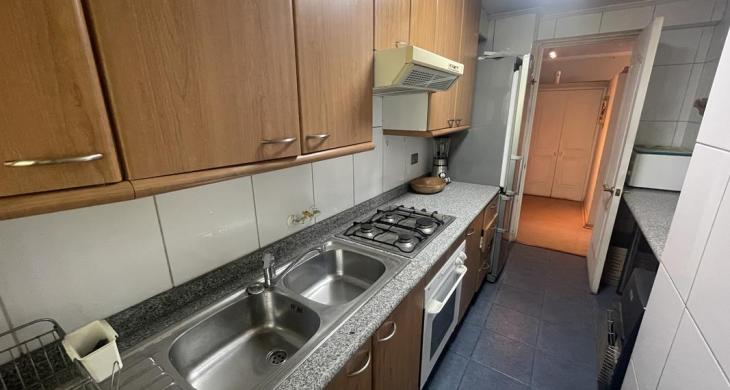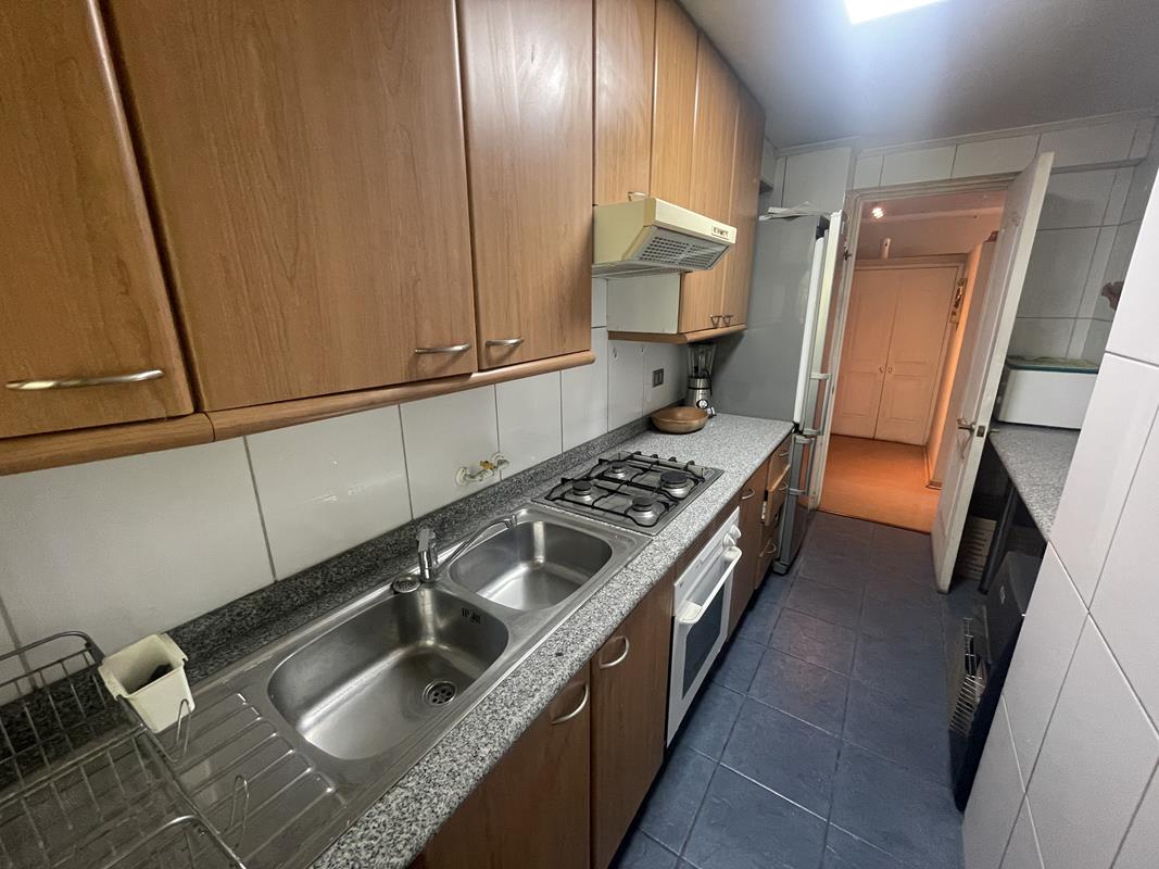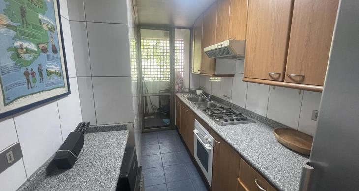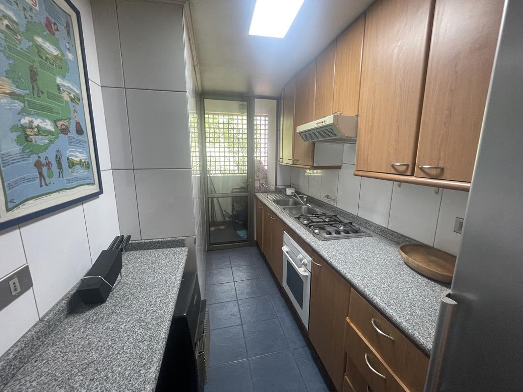 Cocina tradicional amoblada y equipada, mesones de granito, doble lavaplatos, horno, encimera y campana. Cuenta con logia separada, buena ventilación.