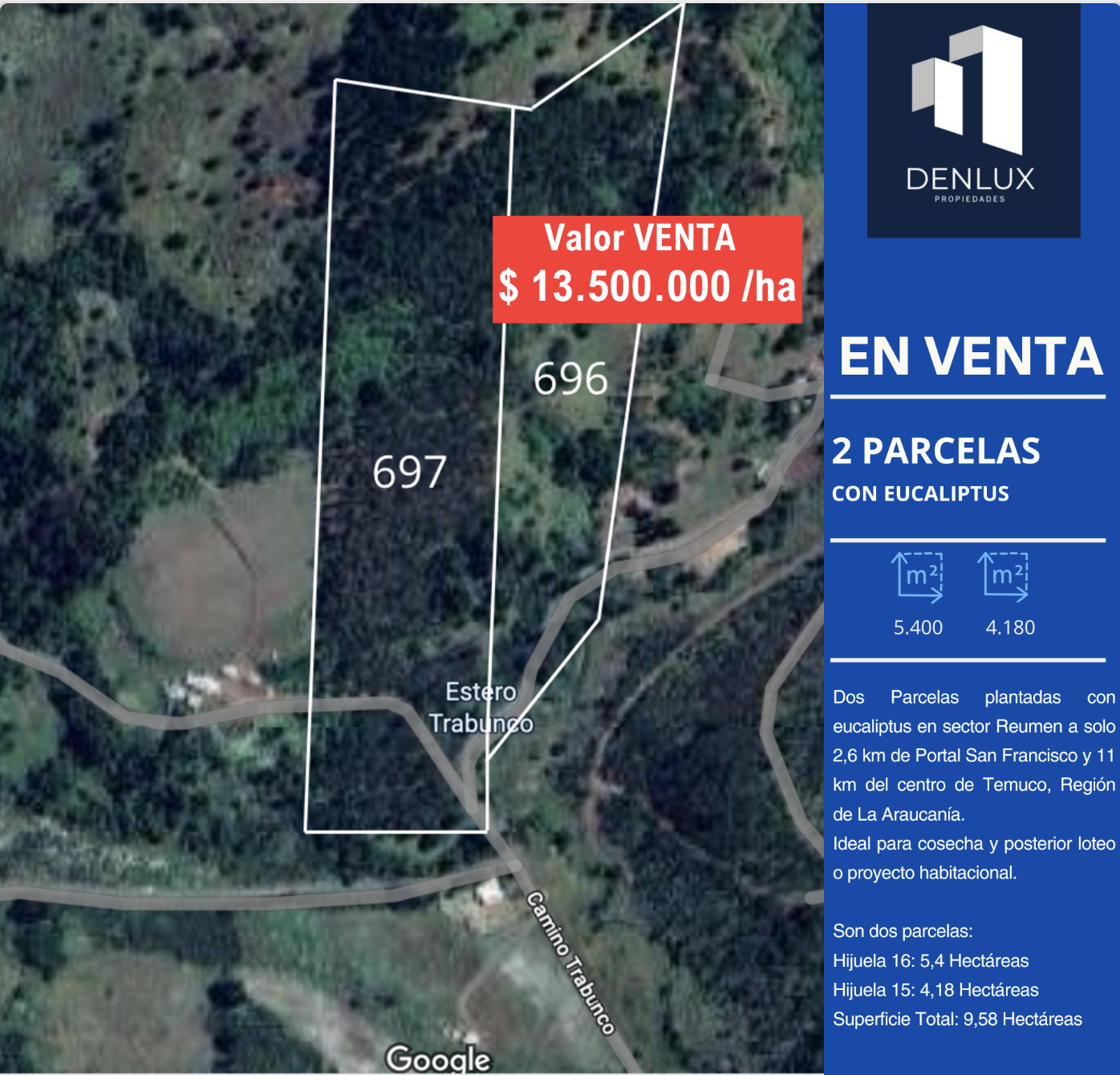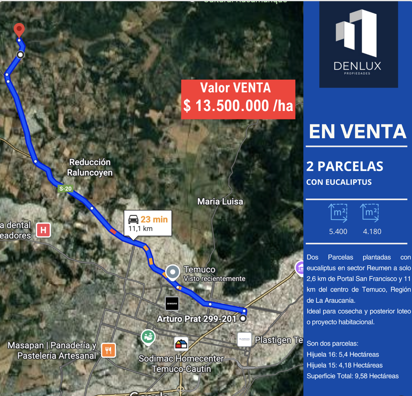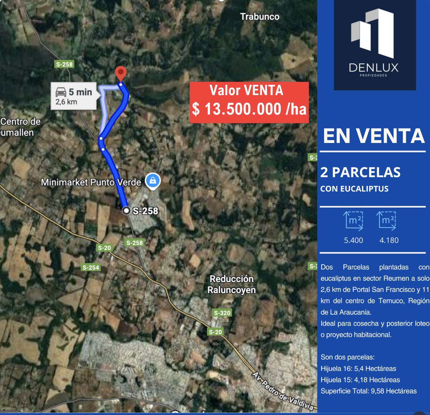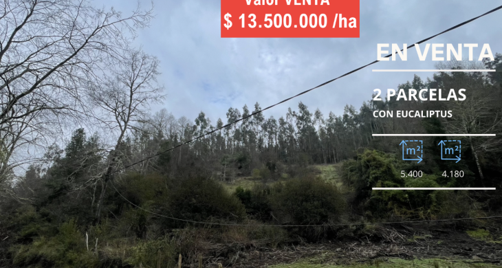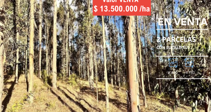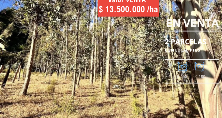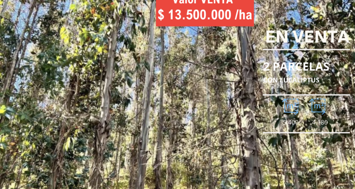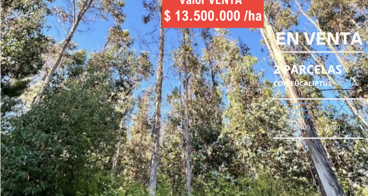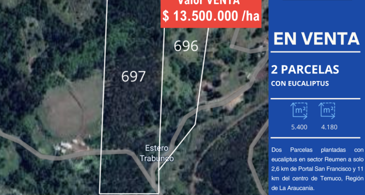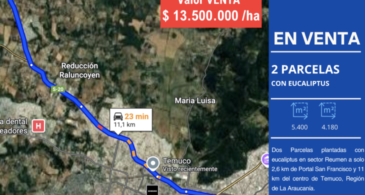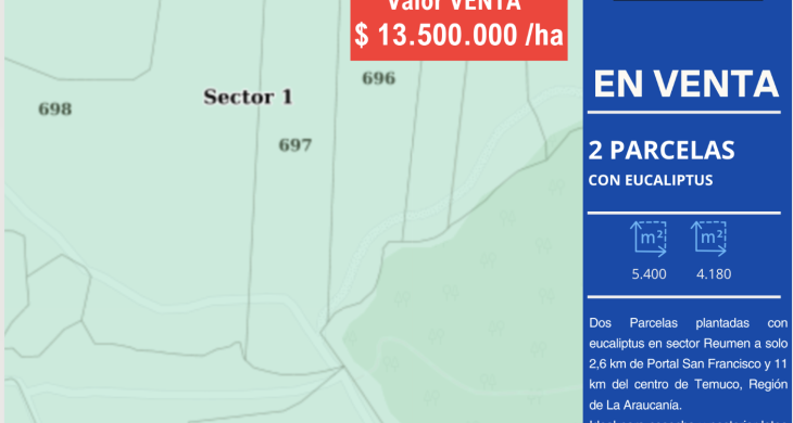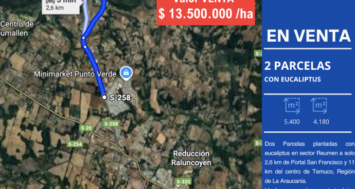 Inversión dos Parcelas plantadas con eucaliptus en sector Reumen a solo 2,6 km de Portal San Francisco y 11 km del centro de Temuco, Región de La Araucanía.