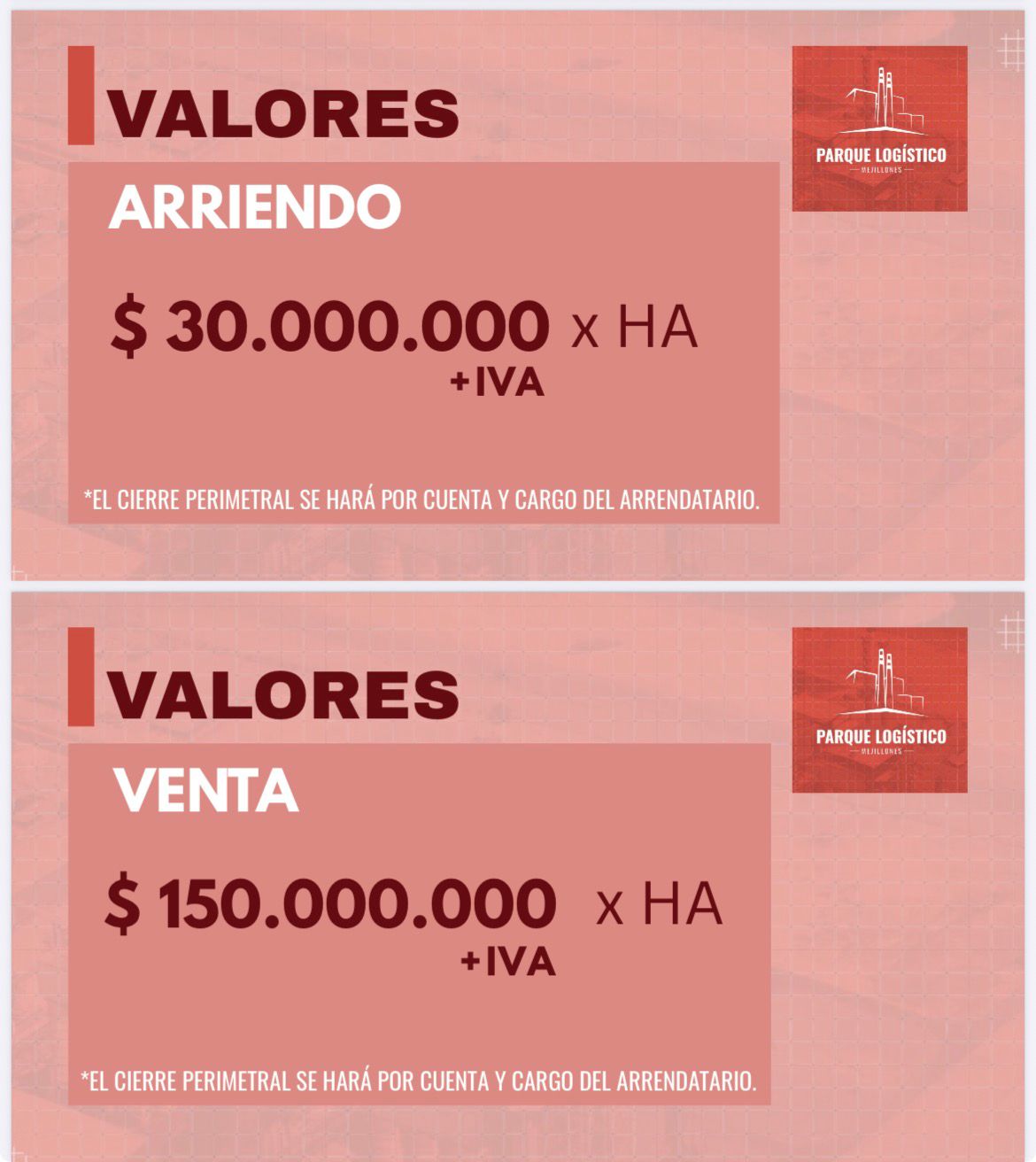 $ 150.000.000 + IVA x HA + Comisión de corretaje.