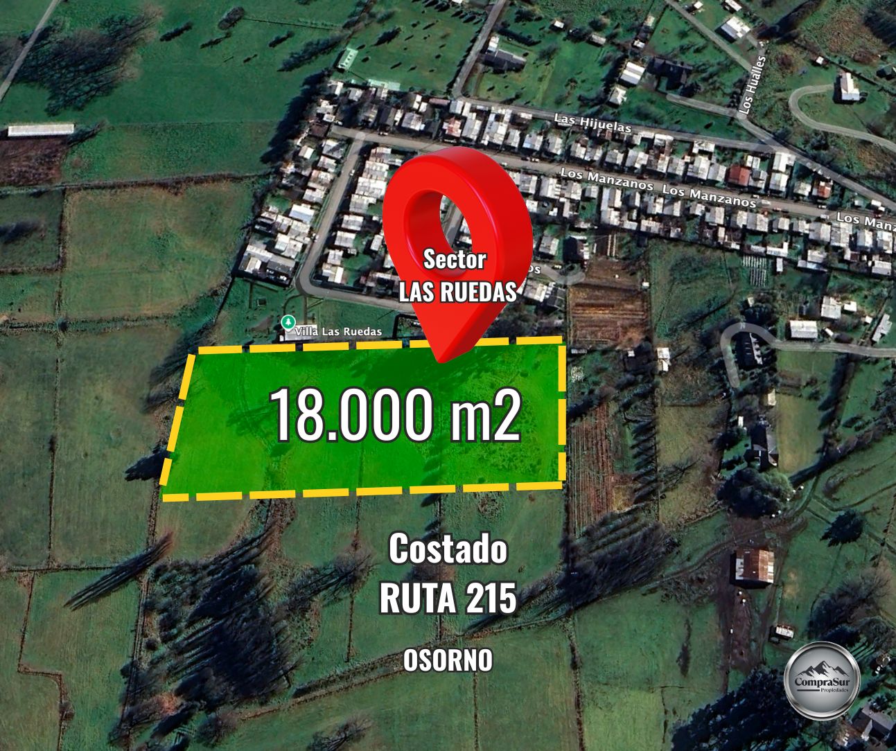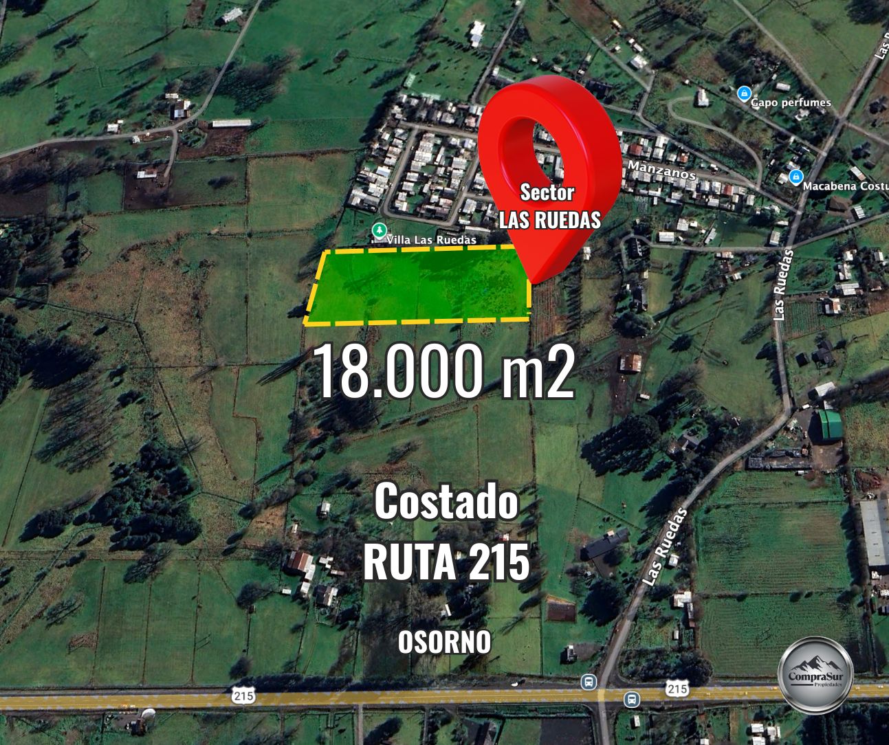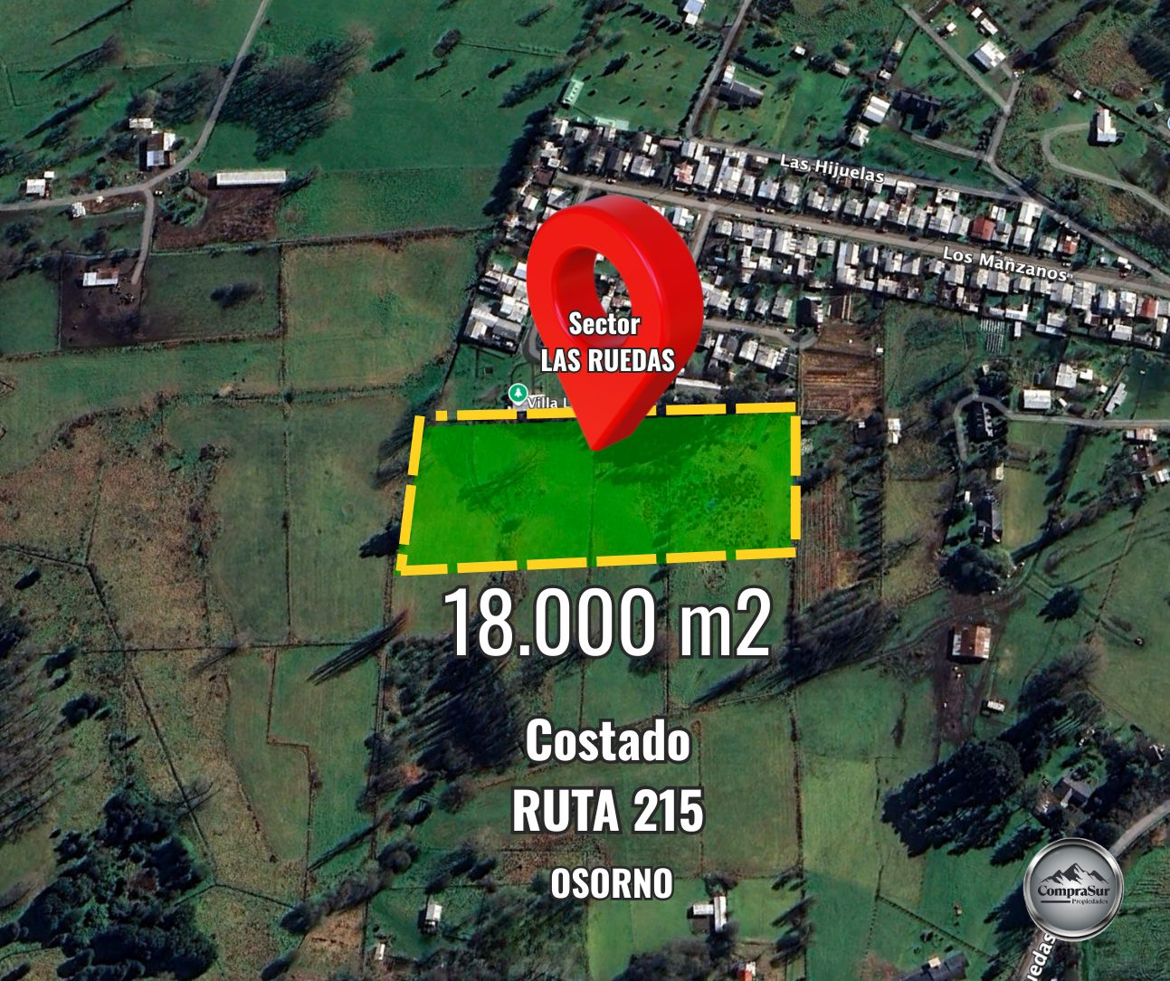 Comprasur Propiedades VENDE excelente terreno ubicado en el sector de La Rueda, a 12 km de la ciudad de Osorno, por la Ruta Internacional 215 Puyehue, sector con creciente desarrollo comercial y loteos.