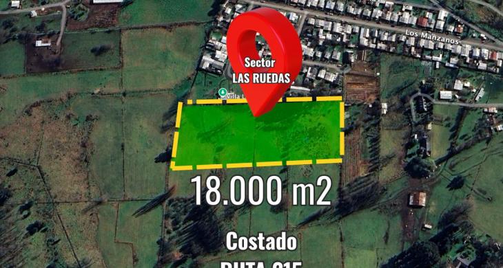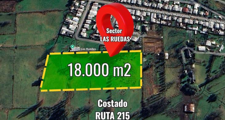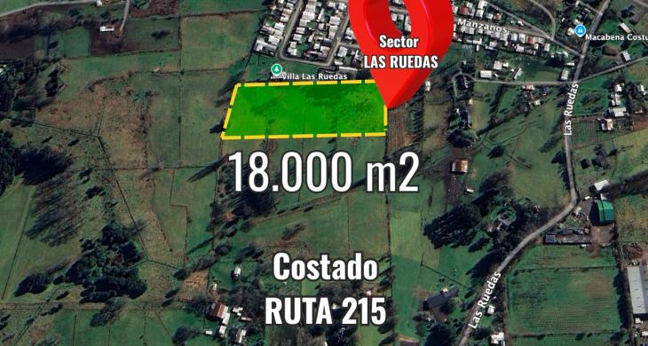 La superficie son 18.100 mts2 (1,81 hás), el terreno es rural, plano y en una ubicación estratégica, muy cerca de la Ruta 215 y a un costado de la villa Las Ruedas, terreno cercano a comercio, colegios, supermercados.